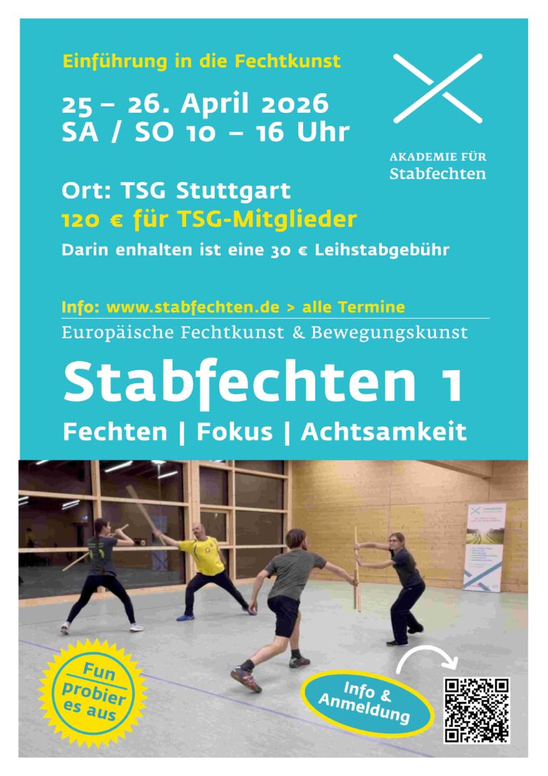 Stabfechten 1 Einführungsseminar in die Grundlagen des Stabfechtsystems. Freude und Spaß bei der Fechtkunst Stabfechten haben. Geheimnisse der Historischen Fechtkunst erfahren. Dozent:Arne SchneiderTrainer und Leiter der Akademie für Stabfechten SA / SO 25. – 26. AprilDauer 2x 6 Stunden SA 10.00 – 16.00 UhrSO 10.00…